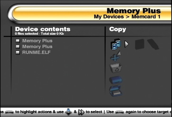 Now boot the Memory Plus card in port 1, this will now load the Memory Plus ELF loader (RUNME1.ELF), which will then load the EXECUTE1.ELF of either the Memory Plus card or the USB pendrive. If the ELF does not exist, the Memory Plus manager will be booted.