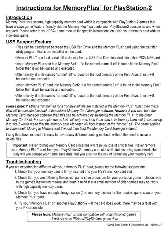 Recently I stumbled upon some interesting information regarding Datel’s new PS2 memory card Memory Plus 64 MB at PS2 Save Tools. What caught my eye were the instructions for this memory card, as they state that you can load an PS2 ELF of the memory card or a USB Pendrive, without the need to load CD/DVD software.