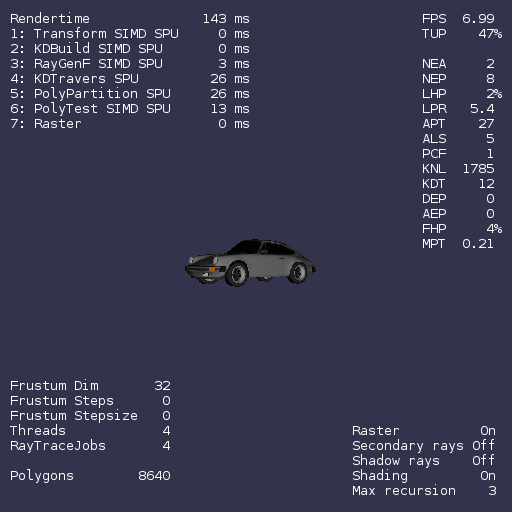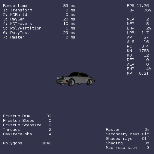 lzrt is a product of my master thesis in computer science entitled “Ray Tracing on the IBM Cell Processor”. The focus in my thesis was on the geometric aspect of ray tracing, optimizing the search for the nearest triangle a ray hits. This is achieved by using a kd-tree as an acceleration structure. lzrt supports animation by rebuilding the kd-tree for every new frame. On the graphics side lzrt is very basic with only Phong shading support, a very basic Lightwave Object (LWO) loader, only supporting one ray pr. pixel and no texture support. lzrt does however support shadow and reflection rays, and also multicore processors. Performance on x86 is quite good, however it is poor on the Cell, considering the potential, please read the lzrt Performance document for more details.